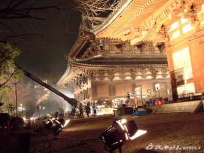 一番高いところに見えるのが、今回大活躍の照明クレーンです。金堂、講堂がかなりの高さなので、照明もがんばらないと明かりが顔を出せません。
