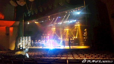 セットに関しては下手MCセットだけだったので、美術部に上下の2段イントレををお願いし、目の字ラダーは照明で用意しました。また、バンド後ろのパーライトは、ムービングライトのケースを並べて暗幕で巻きその上に皿スタンドで設置しました。テレビ中継の為、照明以外にも物が多く、空ケースを置く場所を確保することも難しかったため、逆に利用しました。