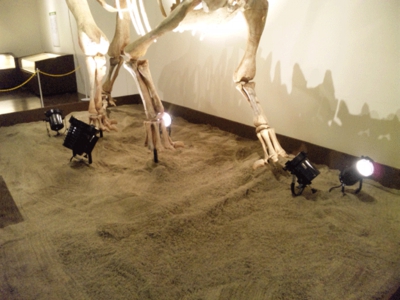 小型の恐竜の場合は、500wクラスのライトを数台使用し、また大型の恐竜の場合は、1Kwクラスのライトも使用し、下からライティングしています。また、上からはレール吊り下げタイプのスポットライトを使用しています。こういう展示会は、恐竜を明るくするだけでなく、壁に出る影にも気を使います。
