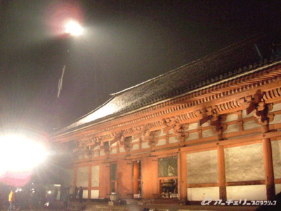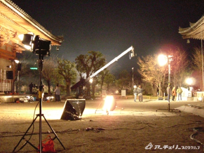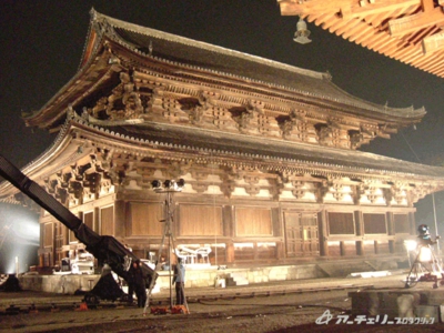 一番高いところに見えるのが、今回大活躍の照明クレーンです。金堂、講堂がかなりの高さなので、照明もがんばらないと明かりが顔を出せません。